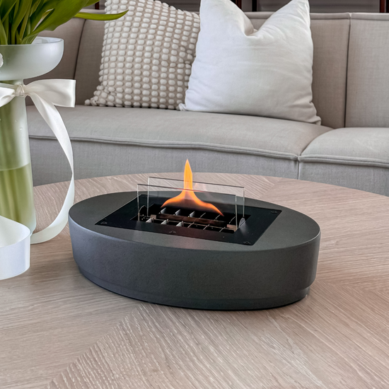 Owalny kominek nablatowy z poziomym knotem - idealny na długie wieczory. Jego charakterystyczny owalny kształt i czyste linie uosabiają minimalistyczne piękno.